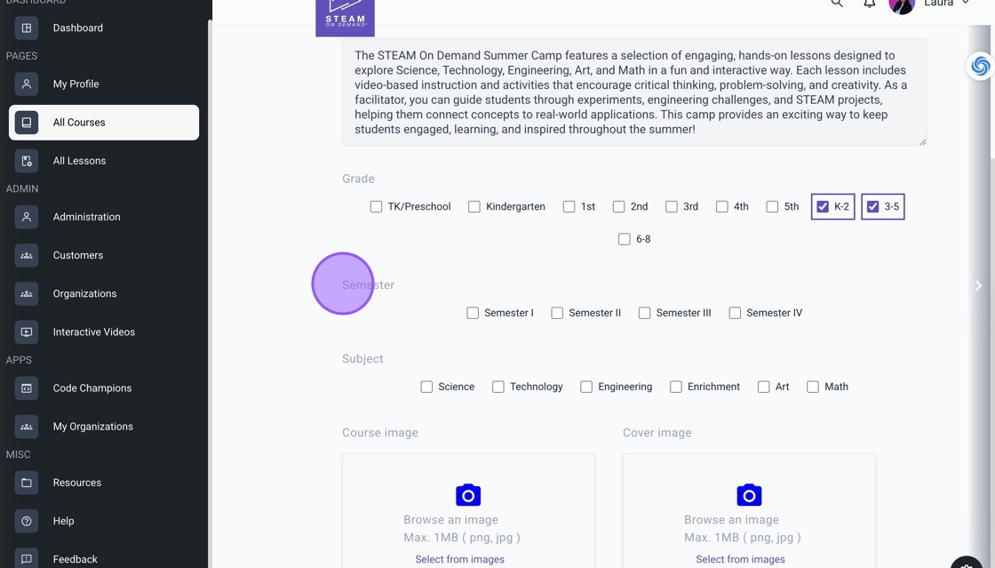 8. Upload an image for your course, then click the arrow to move to the next step.