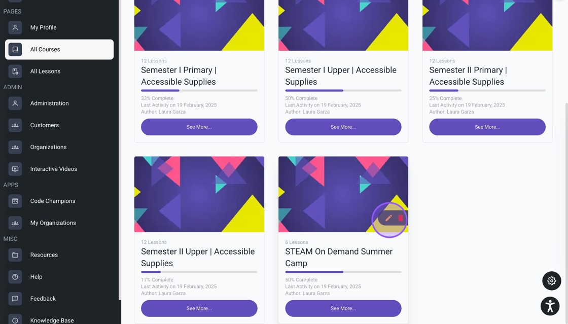 19. Locate the course, then click the pencil icon to edit or the trash icon to delete it.
