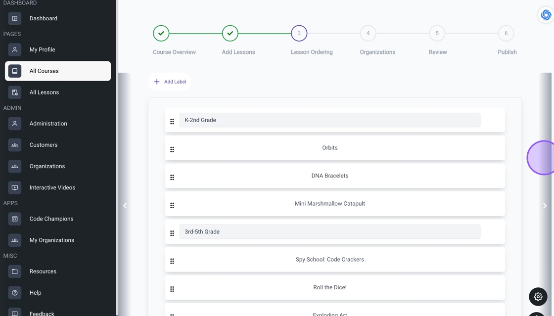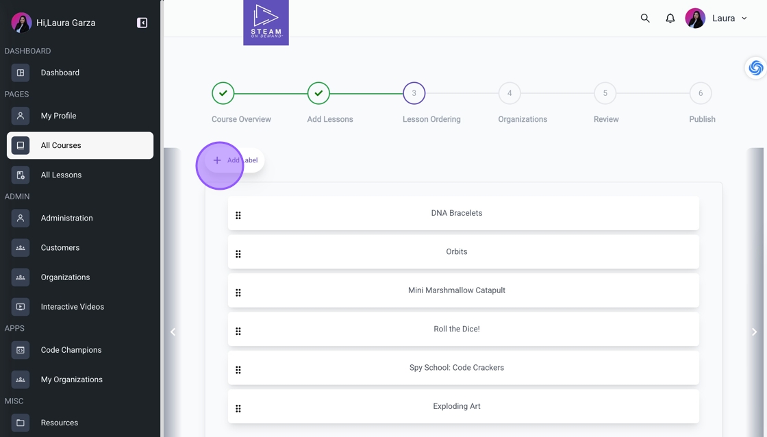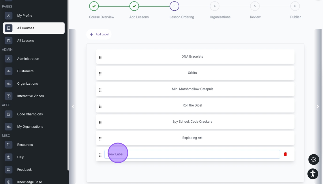 14. Drag the label to its designated spot and arrange the lessons in your preferred order. Click the arrow to finalize this step.