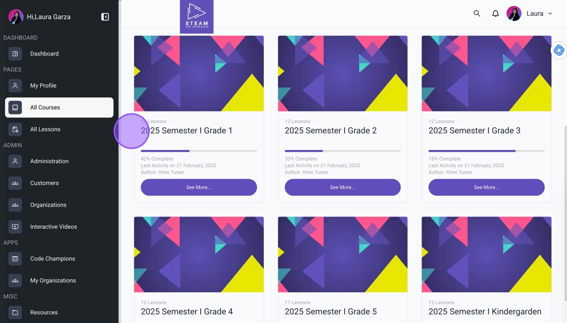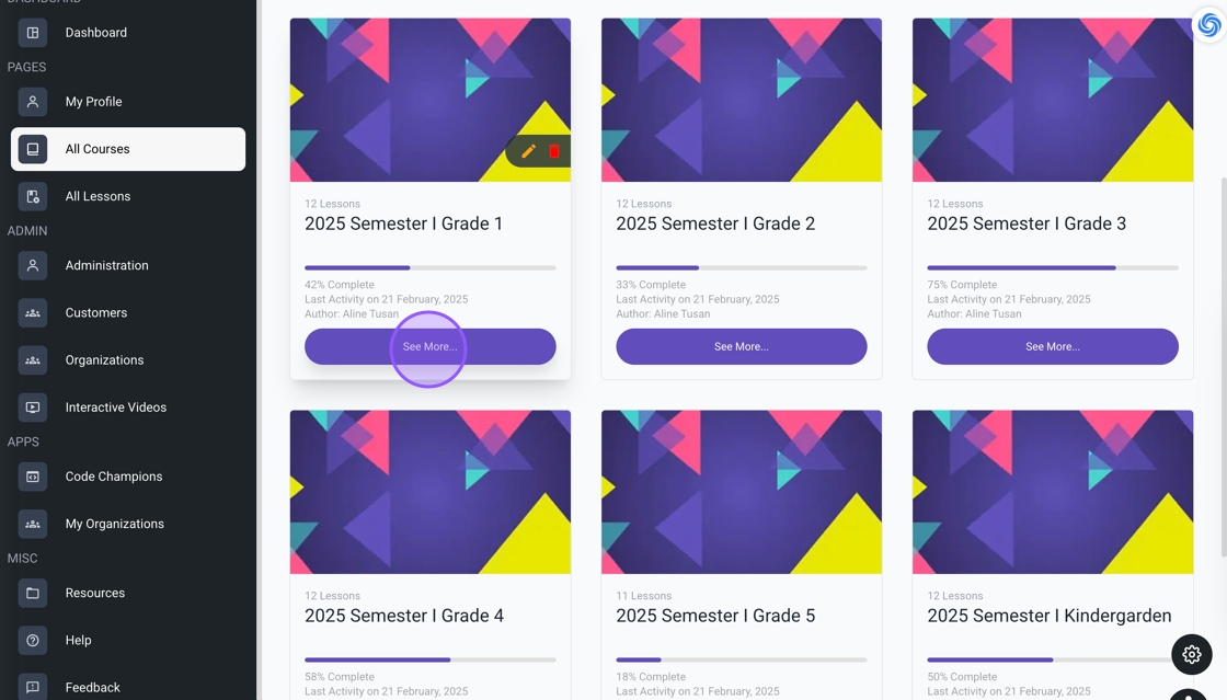 The All Courses section provides access to pre-organized courses categorized by semester, grade level, and available supplies. Each course includes 12 structured lessons, a master supply list, and progress tracking to keep learning organized. Easily navigate lessons, access resources, and plan materials efficiently for a seamless classroom experience.