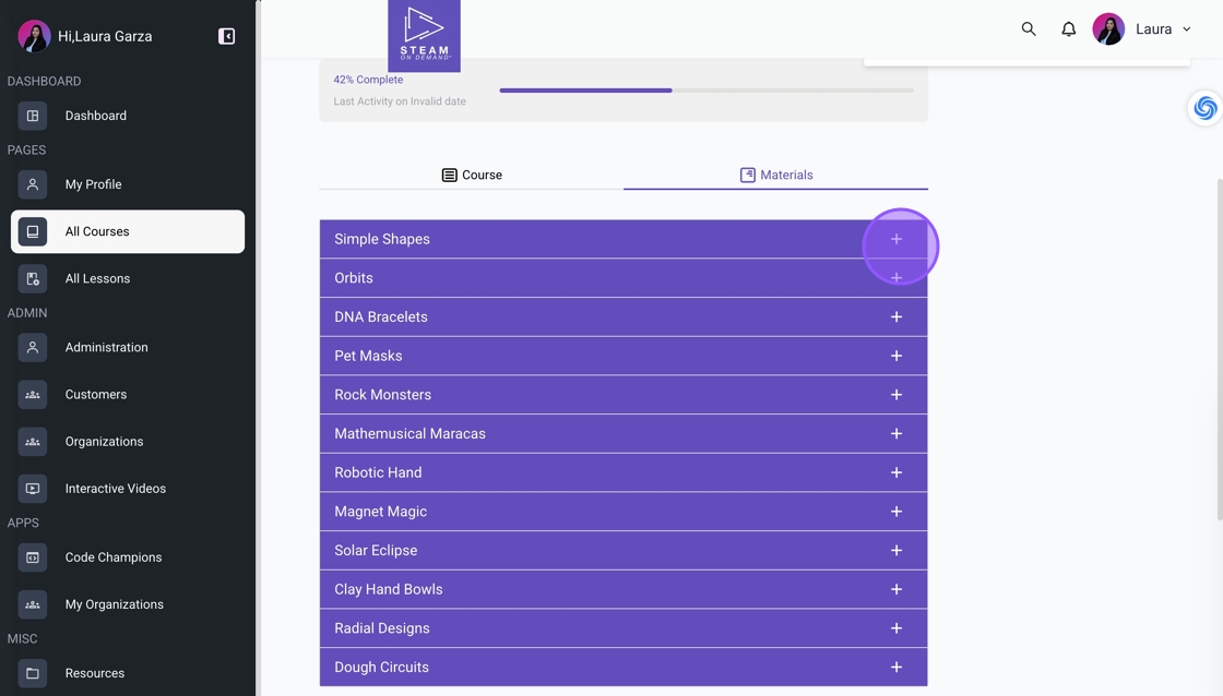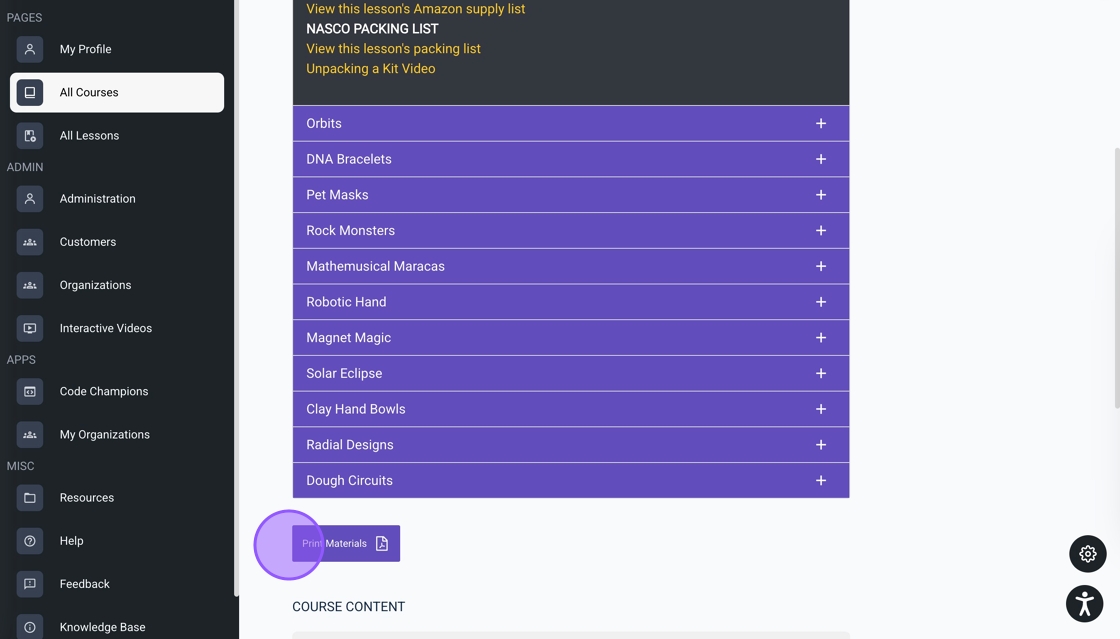 6. Next to the course content, you'll find a master supply list to help plan materials in advance. Click the "+" icon to expand or collapse each lesson’s materials.