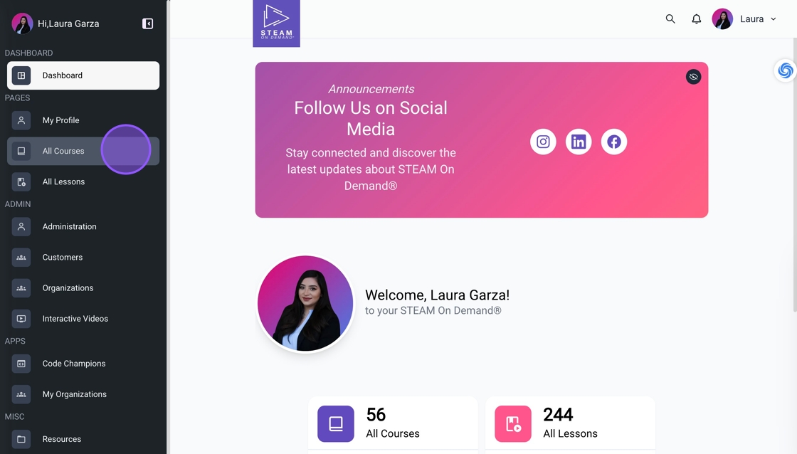 1. On the dashboard, click "All Courses" from the left-side panel or select the All Courses icon.